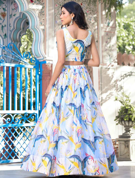 Blue Georgette Floral Digital Print Micro Cotton Ethnic Lehenga Choli