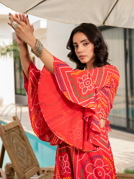 Red Cotton With Organza Ethnic Bandhani Print Lehenga Choli