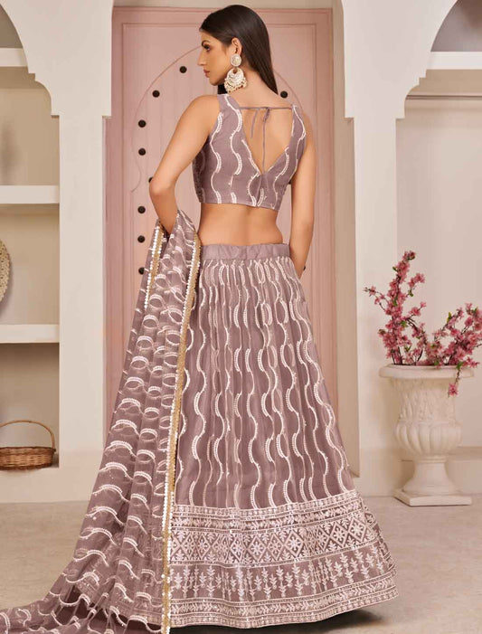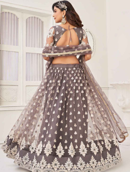 Dusty Brown Butterfly Net Ethnic Embroidery Semi-Stitched Lehenga Choli