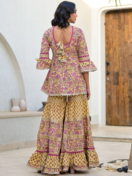 Yellow Floral Print Cotton Ethnic Kurta Sharara Set For Women