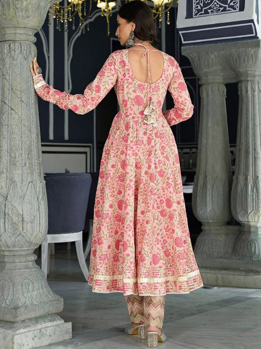 Pink Floral Hand Block Printed Anarkali Kurta With Dupatta Set