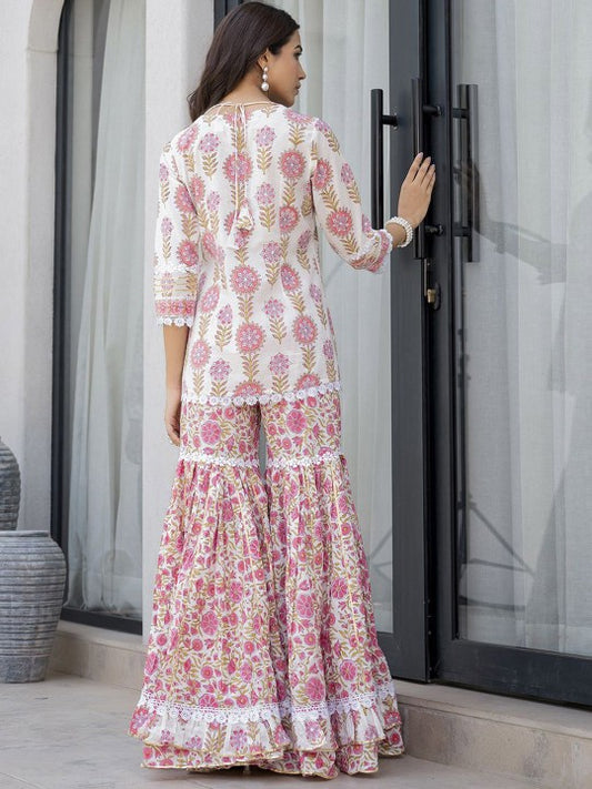 Ethnic White Floral Print Pure Cotton Kurta Sharara Set for Women