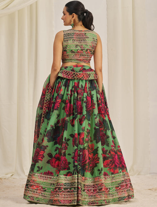 Parrot Green Organza Semi-Stitched With Zari & Sequins Lehenga Choli