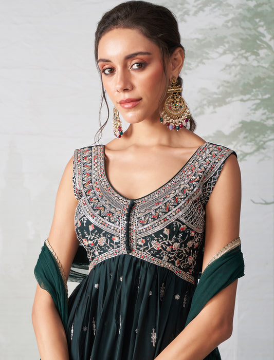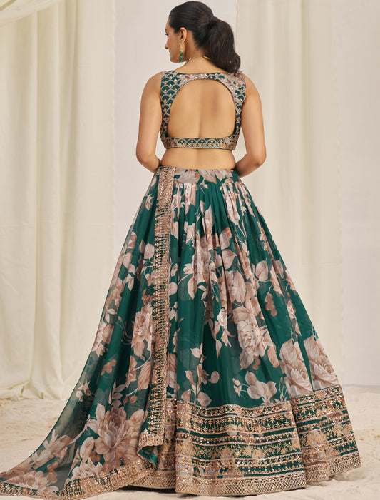 Dark Grreen Organza Semi-Stitched With Zari & Sequins Lehenga Choli