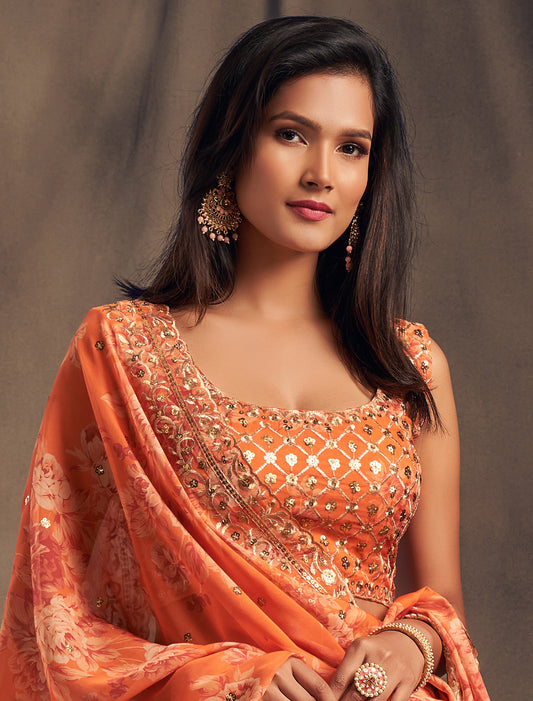 Orange Organza Semi-Stitched With Zari & Sequins Designer Lehenga Choli