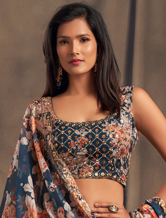 Blue Organza Semi-Stitched With Zari & Sequins Designer Lehenga Choli