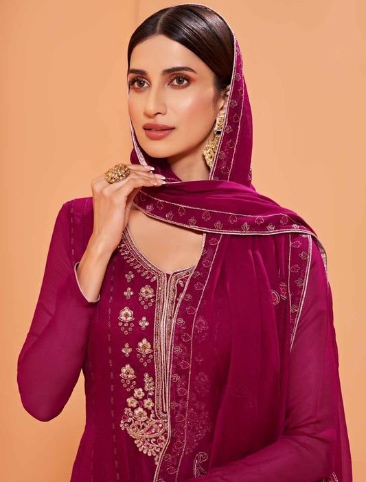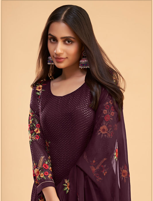 Wine Georgette Ethnic Semi Stitched Salwar Suit For Women With Zari Embroidery