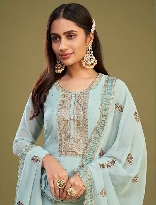 Firozi Georgette & Dull Santoon Ethnic Embroidery Work Kurta Sets