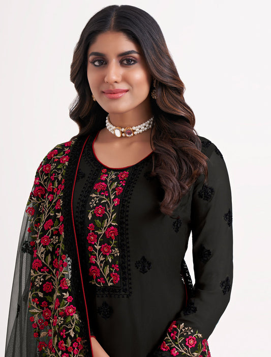 Black Ethnic Women Semi Stitched Embroidered Salwar Suit With Bottom And Dupatta