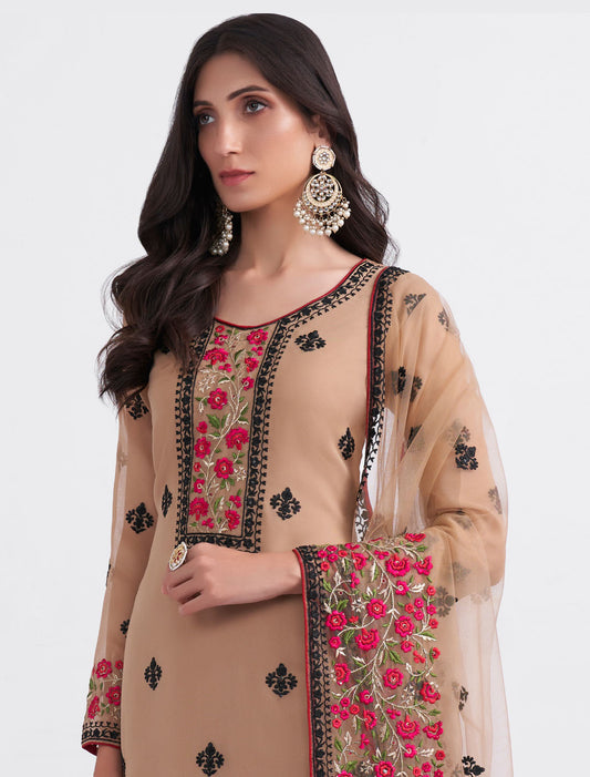Light Brown Ethnic Semi Stitched Traditional Kurta Set For Women With Sequins, Zari Embroidery and Stone Work,
