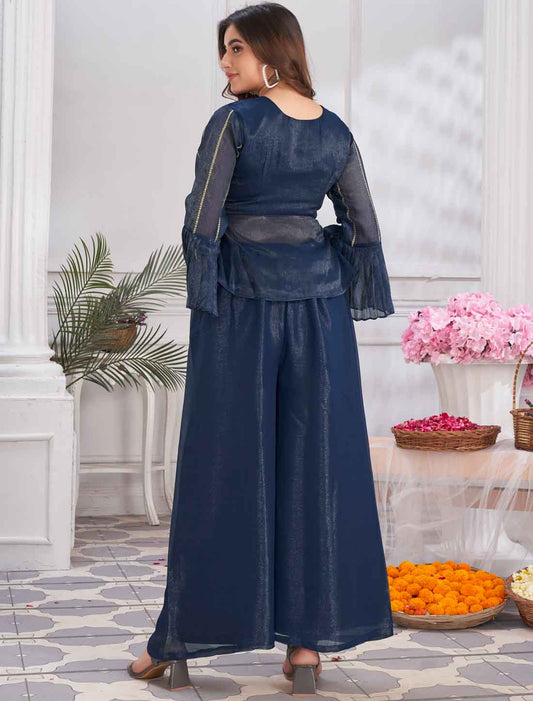 Blue Elegant Shimmer Georgette Fancy Crop Top with Sharara an Choli