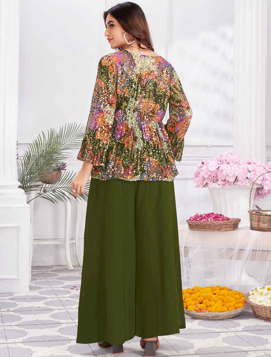 Green Ethnic Semi Stitched Kurta Set For Women With Sequins, Zari Embroidery and Stone Work,