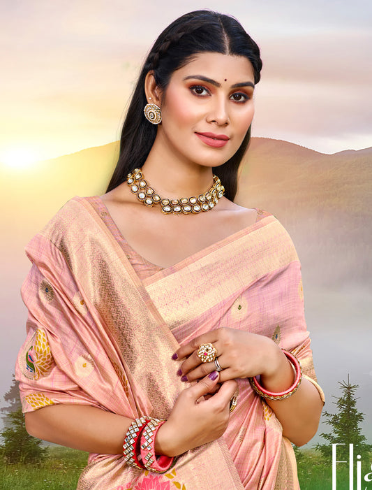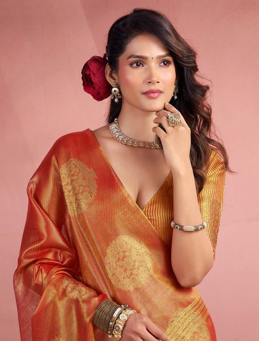Peach Party Wear Tissue Silk Woven Saree For Women