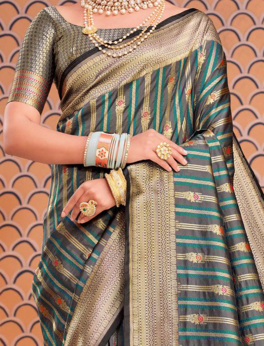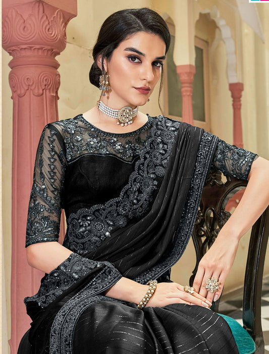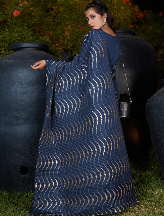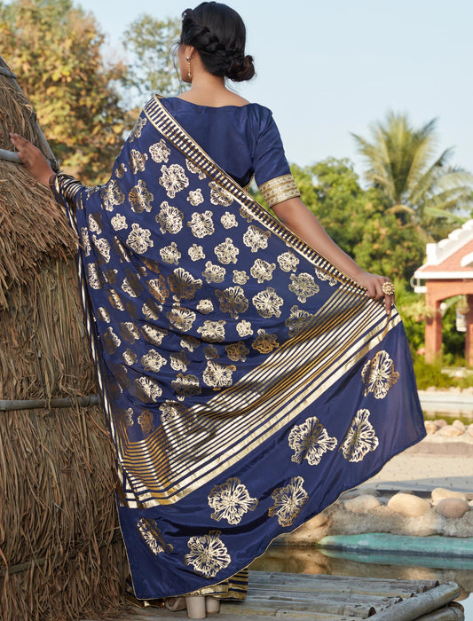 Navy Blue Foil Work Designer Weadding & Party Silk Saree For Women
