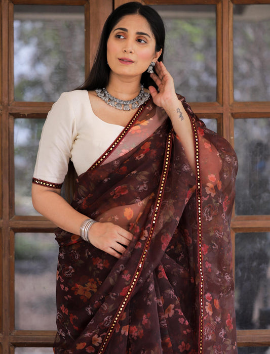 Kasab Georgette TFH Sandal Wood Party Wear Designer Saree For Women
