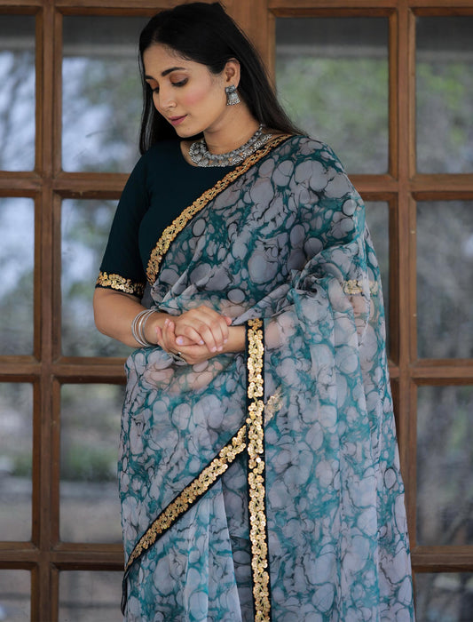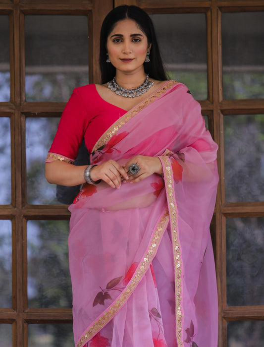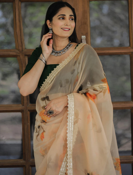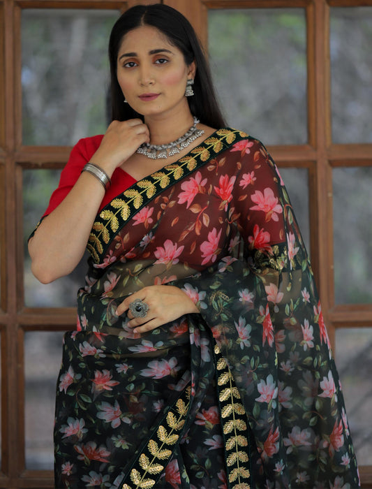 Heavy Digital Print & Lace Work Designer Silk Saree For Women