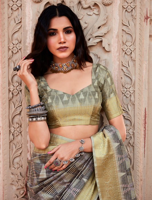 Lime Gold Ethic Hanloom Silk Designer Party Wear Saree
