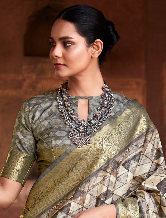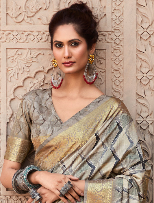 Stone Grey Handloom Silk Party Wear Designer Ethnic Saree