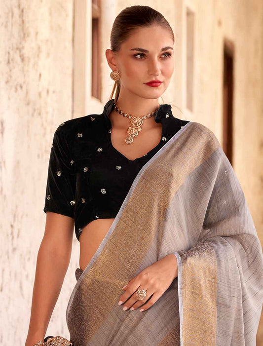 Grey Ethnic Linen Velvet Emboridery Work Designer Saree