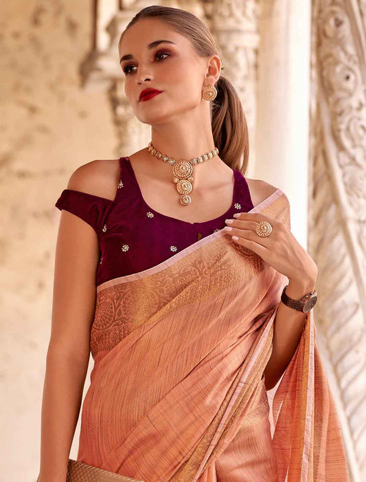 Peach Ethnic Linen Embroidery Work Designer Saree