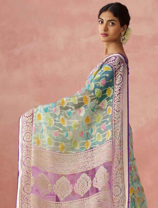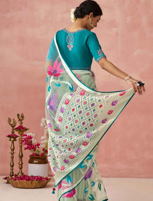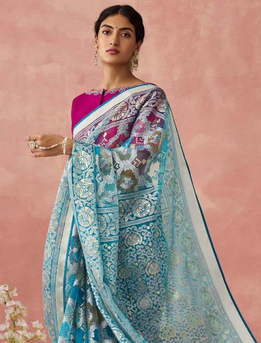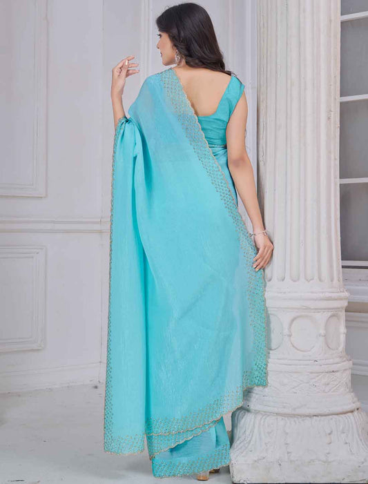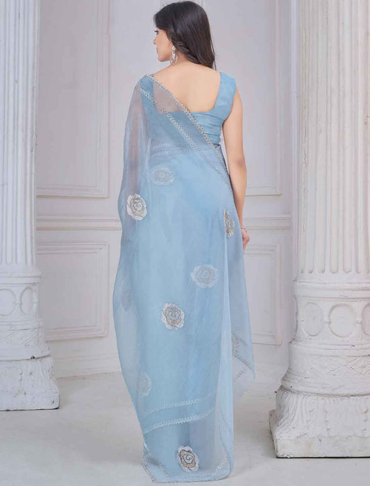 Light Blue Ethnic Organza Party Wear Traditional Work Saree