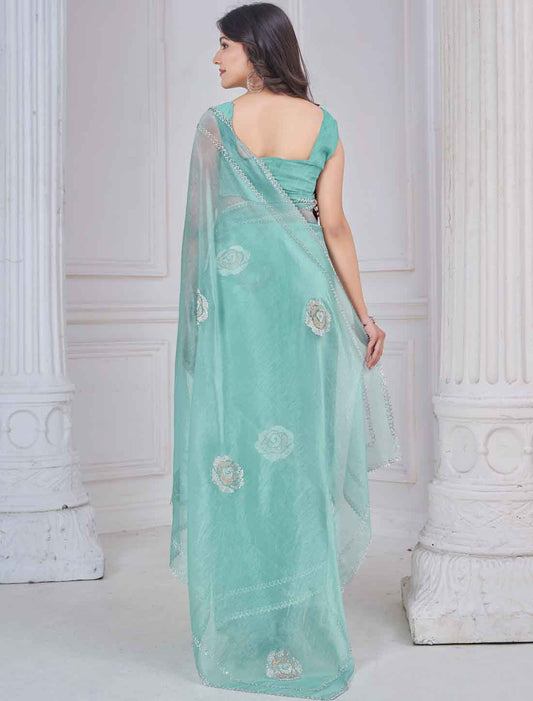 Teal Blue Ethnic Party Wear Organza Traditional Work Saree