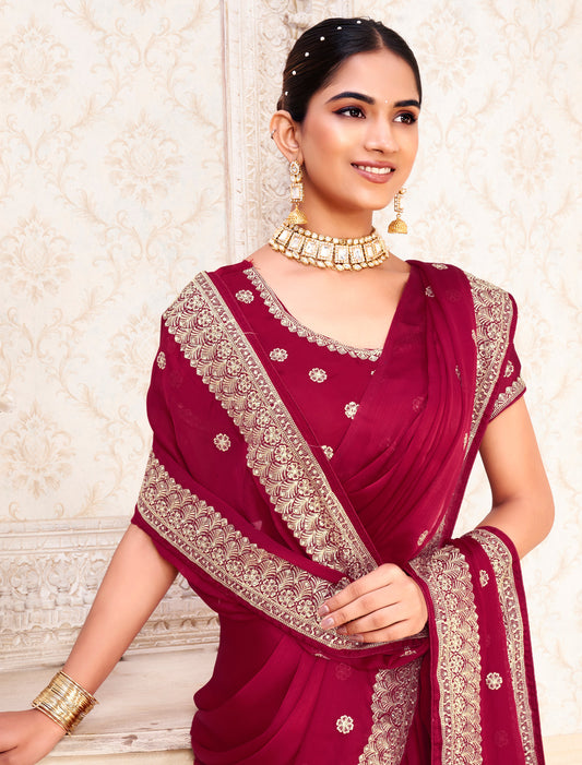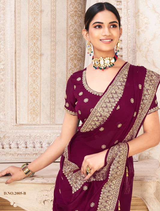 Wine Ethnic Designer Saree with Heavy Blouse Border For Women