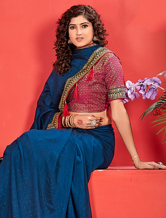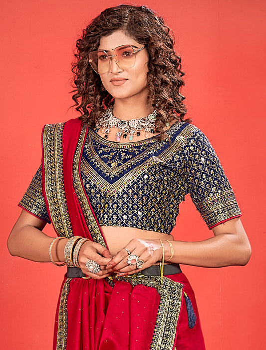 Blue Ethnic Vichitra Silk Saree With Red Heavy Work Blouse