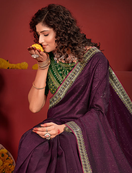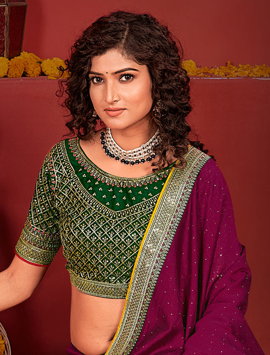 Ethnic Purple Vichitra Silk Saree With Green Heavy Work Blouse