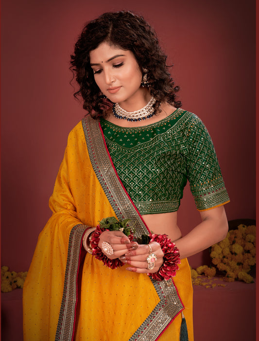 Green Ethnic Saree with Yellow Work Blouse For Women