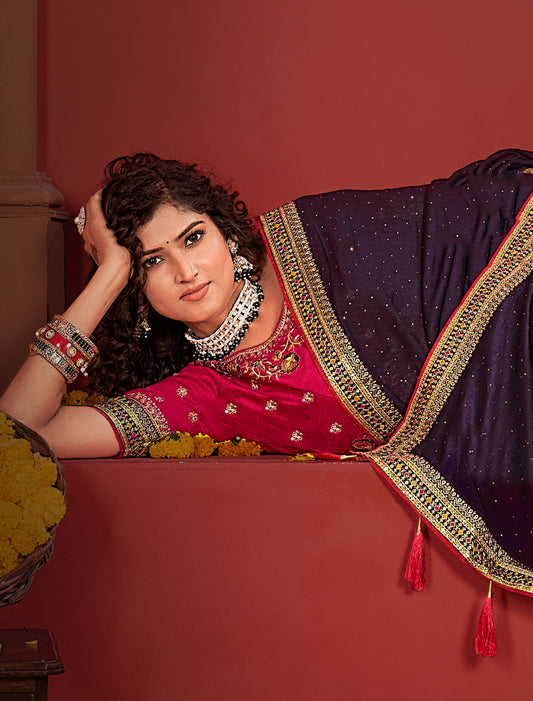 Purple Ethnic Vichitra Silk Saree Red Heavy Work Blouse