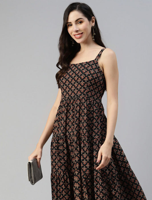 Black Ethnic Motifs Midi Party Wear Dress For Women