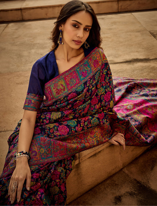 Navy Blue Silk Blend Woven Saree With Kashmiri Jamewar Type Wear For A Special Occasion