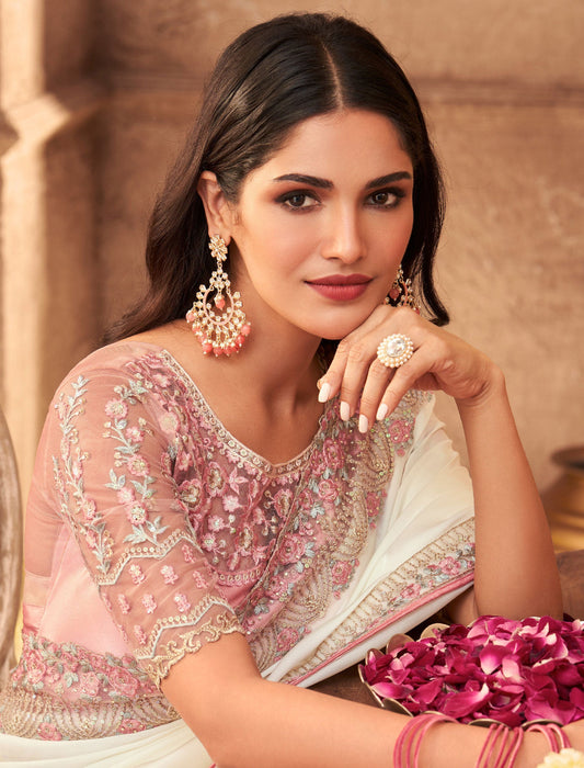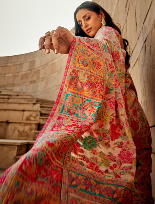 Cream Silk Blend Woven Saree With Kashmiri Jamewar Type Wear For A Special Occasion