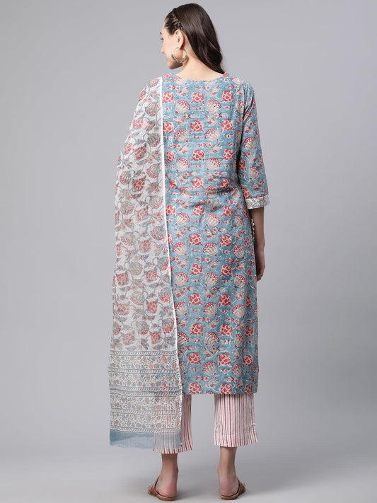 Divena Sky blue Hand Block Printed Straight kurta Pant Set with Dupatta