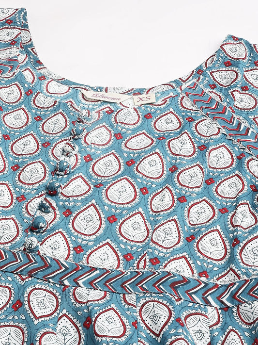 Divena Turquoise Blue Cotton Anakali Kurta pant set with Dupatta