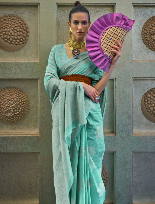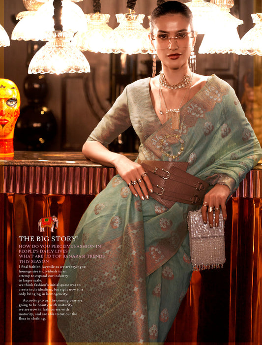 Pure Linen Copper Zari Splendor Multi Handloom Weaving Saree