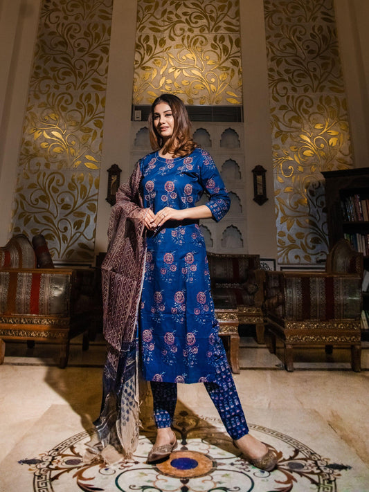 Divena Navy Blue Printed Cotton Kurta Set With Dupatta