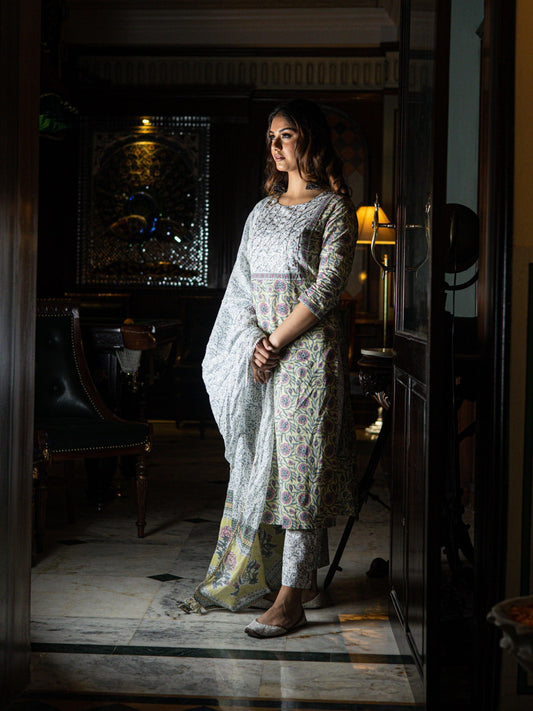 Divena Turquoise Blue Cotton Floral Printed Kurta Pant set with Dupatta