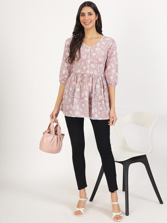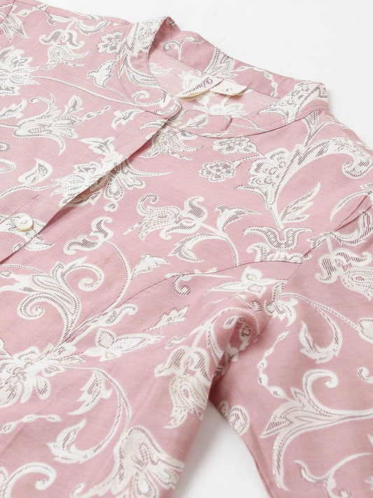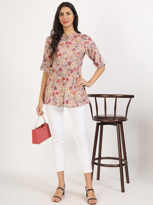 Dusty pink Floral printed Modal A-line Shirts Style Top