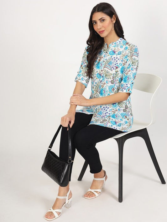 Ethnic White Floral Printed Viscose Rayon Casual Top