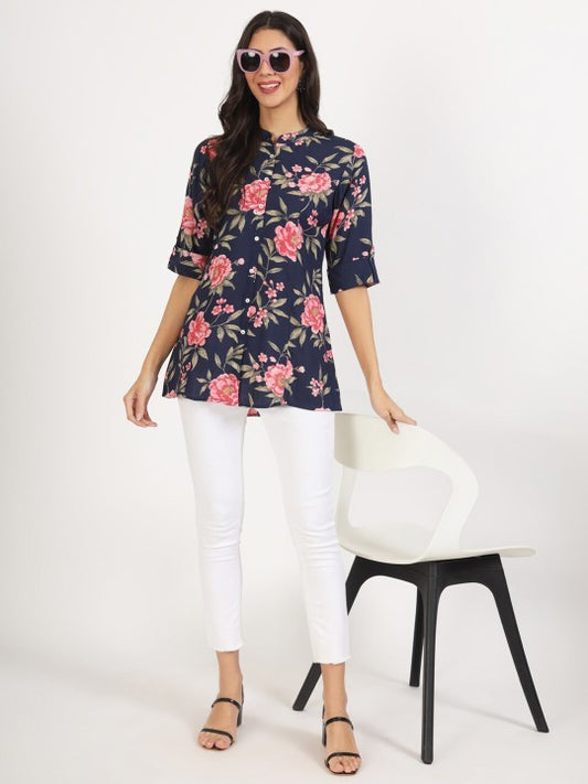 Navy Blue Floral Printed Rayon With 3/4th Sleeves Casual Top