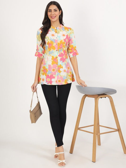 Divena Multi Floral Rayon Shirt Style A-Line Top