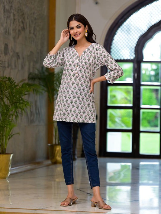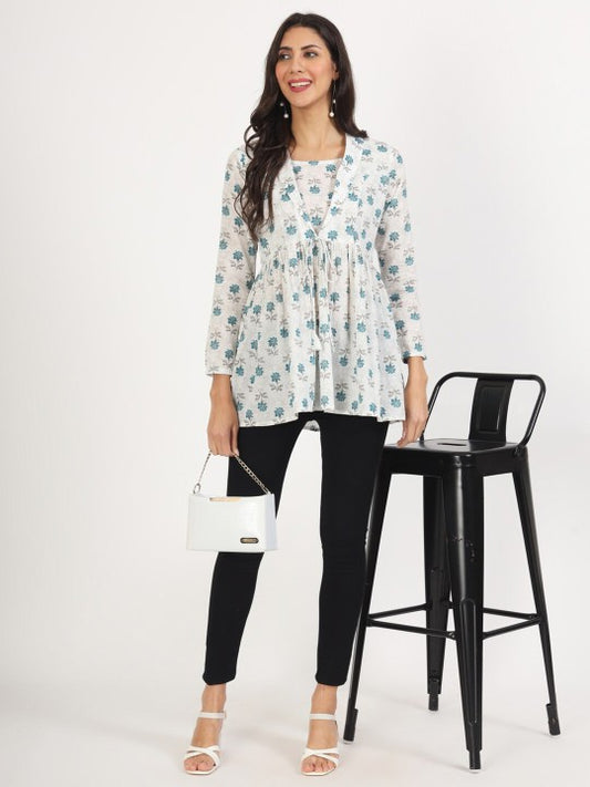 Ethnic Grey White Floral Printed Cotton Top For Women