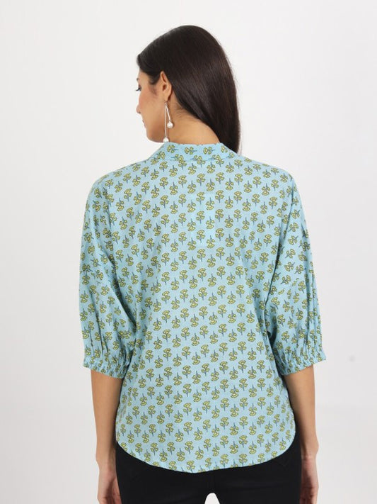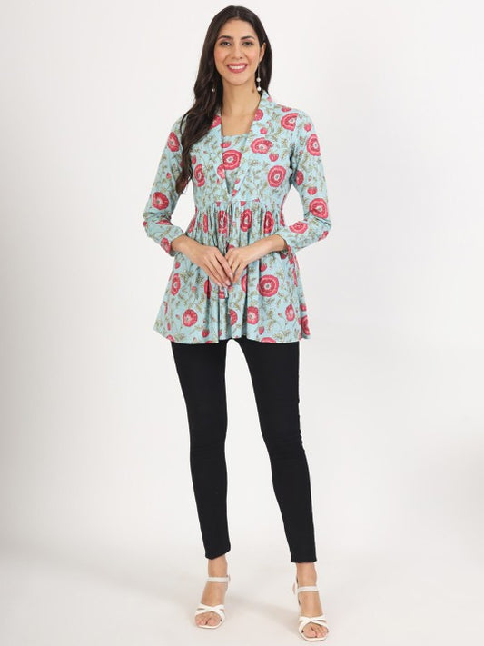 Ethnic Sky Blue Floral Printed Pure Cotton Casual Tops