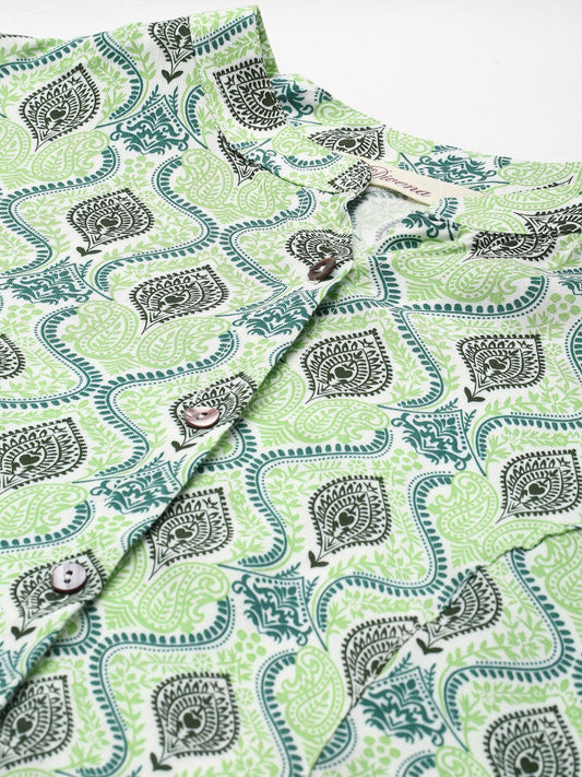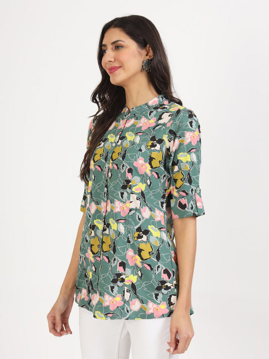 Divena Light Green Floral Rayon Shirt Style A-line Top