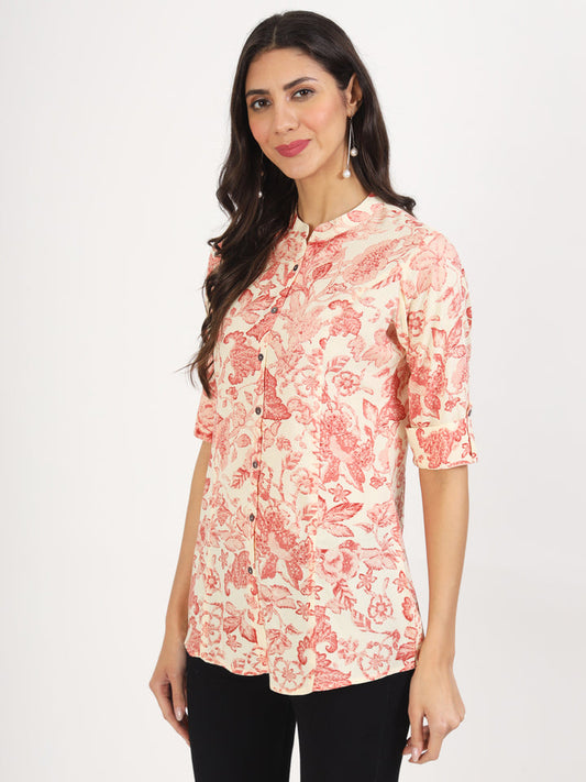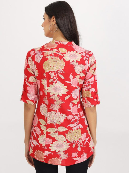 Red Floral Printed Viscose Rayon Ethnic Casual Top