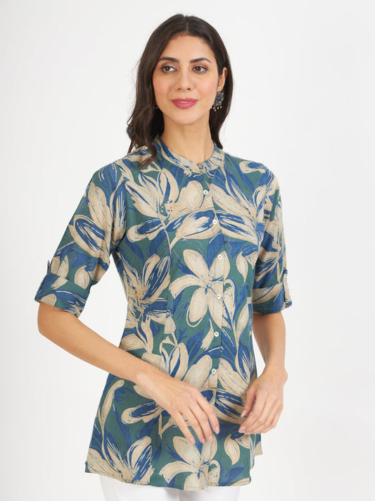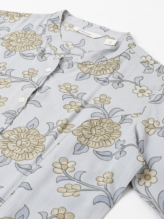 Dusty Blue Floral printed Rayon A-line Shirts Style Top