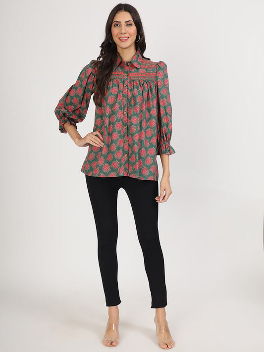Ethnic Green Pink Floral Printed Rayon Top For Women