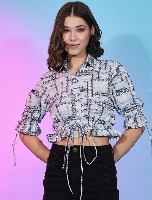 Divena White & Blue Floral Printed Empire Cotton Tops